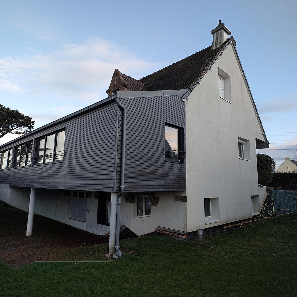 - Bardage lasuré gris pour une harmonie parfaite avec l’existant